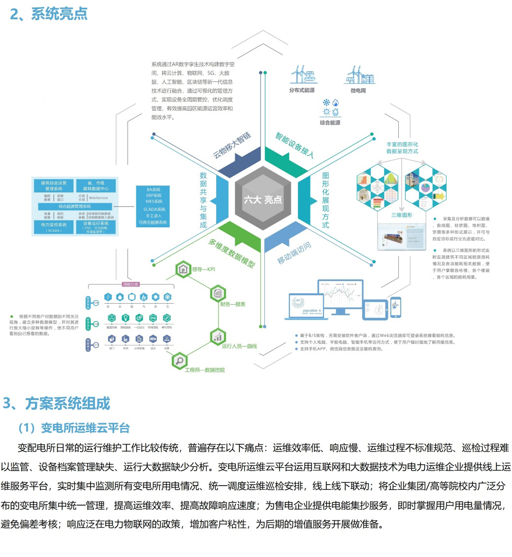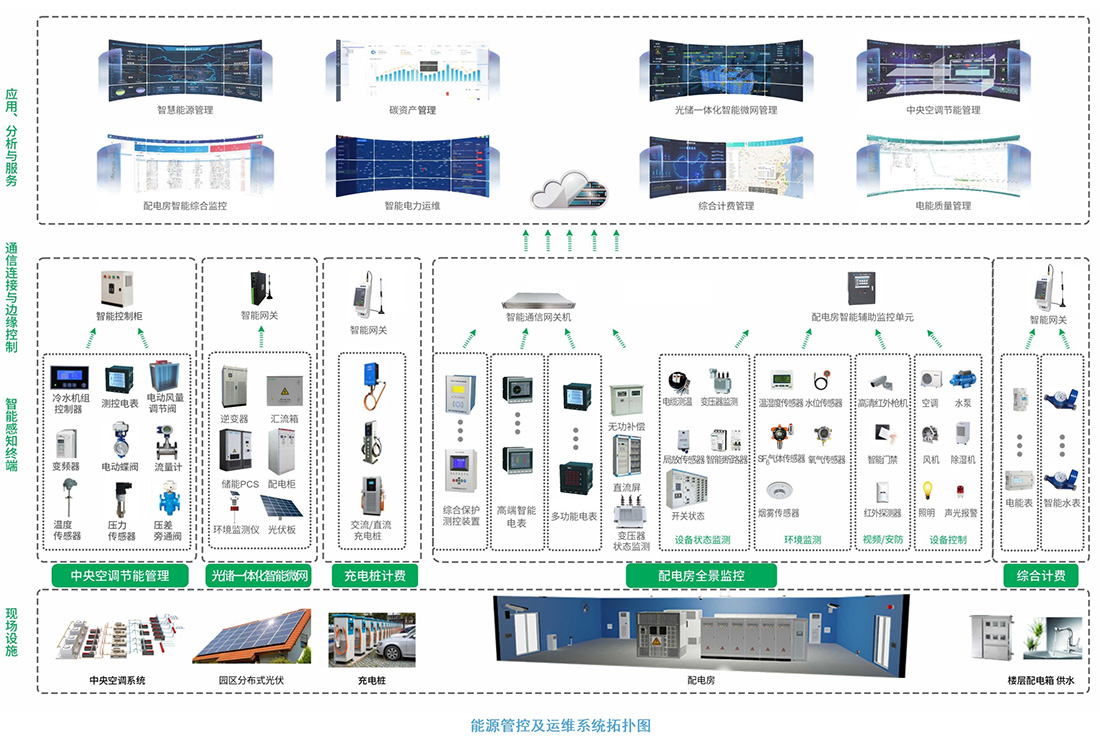 本系统通过边缘智能设备连接能源、楼宇、弱电、循环等子系统,将数据接入数字平台,支撑能源、碳、碳能交易和综合管理,开展碳能大数据分析,助力智慧运营管控,实现园区绿色高效、全域融合和智慧敏捷的目标。